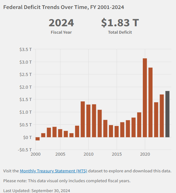 The US Deficit for Fiscal Year 2024 was $1.83 trillion. We brought in Revenue of $4.92 trillion and spent $6.75 trillion. That deficit is projected to be $1.9 trillion in 2025 [2]. Importantly, the credit downgrades have less to do about the U.S. meeting their obligations today and more about the trajectory of our debt growth.