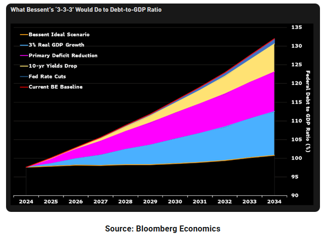 Below is a chart that highlights how sizeable it’s impact can be in 2034 under Secretary Bessent’s “Ideal Scenario.” Ultimately, our debt/GDP could fall from a projected ~133% today to 100% – much more manageable over the long haul. Absent real & hard cuts to spending, we must grow the economy at a faster rate.