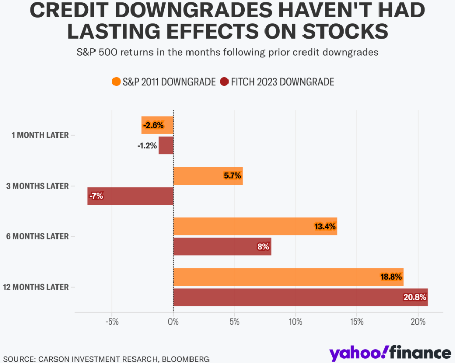 If history serves as a guide, stocks recovered quite well following the 2011 and 2023 downgrade of U.S debt. While the S&P 500 has already recovered better than the 1 month data below, we’ll see if the other data rings true.[7]