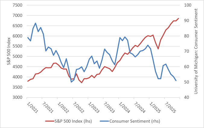 This divergence has contributed to what is increasingly described as a K-shaped economy, where outcomes for higher- and lower-income consumers continue to move in opposite directions. A similar pattern has emerged in the corporate landscape. Mega-cap companies have maintained stronger earnings growth and more flexible cost structures, aided by lower leverage and a greater share of fixed-rate debt issued prior to the rise in interest rates. The chart below highlights this divergence, as broad measures of consumer sentiment remain historically subdued even as equity markets reached new highs.[1].